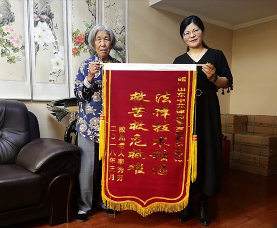2017年8月,中苑律师事务所财富传承与婚姻家事部主任吴东玲律师接青岛市法律援助中心指派,为胶州市胶西镇大刘家疃村老人李秀芳与儿子朱某赡养纠纷上诉一案提供法律援助。接案后,吴律师高度重视,认真撰写上诉状、全面搜集证据、在法庭上据理力争、在法庭外与法官深入沟通,上诉请求最终得到了青岛中院的支持,判决朱某向李秀芳支付赡养费、医疗费,以及交付居住房屋。老人收到判决后喜极而泣。两次坐车从胶州到中苑所现金答谢吴律师均被婉拒。图为李秀芳向中苑所赠送锦旗。