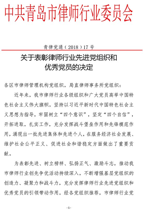 2018年7月3日,中共青岛市律师行业委员会,经各党组织推荐,市律师行业党委研究,报市司法局党委研究同意,决定对23家先进党组织和53名优秀党员进行表彰,中共山东中苑律师所党支部书记纪斌律师被授予“青岛市律师行业优秀党员”荣誉称号。